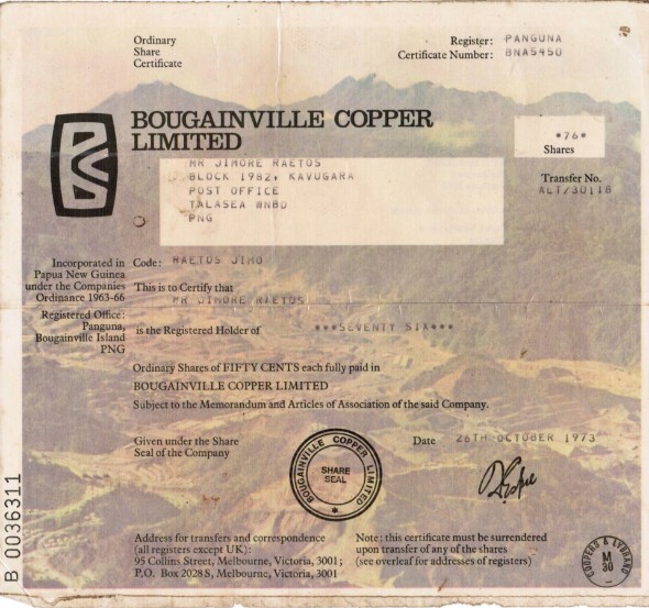 Since many years the European Shareholders have been hunting for pictures of hardcopy shares of Bouganiville Copper Limited (BCL). Today, an unexpected email reached the ESBC.It contained two copies of the original Bougainville Copper shares (pictured).They are supposed to value still the amount of shares indicated. Nevertheless: Since BCL decided to issue virtual shares only, these shares have to be considered as collectible items. Unfortunately BCL shares are not as attractive as some classical shares issued by big companies in the beginning 20th century. But, for people who entertain friendly relations to Bougainville, these shares might represent a special nostalgic value as a souvenir of better days. Now it's up to Bougainvilleans to make these better days come back again!