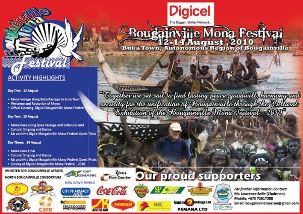 Le Festival Mona 2010 FESTIVAL SUCCESS By Aloysius Laukai (16.08.2010) The second Bougainville Mona Festival 2010 was hailed a success. The three- day show attracted more than TEN THOUSAND people throughout the festival. The Mona Festival which is a cultural show featuring the locally built traditional Bougainville canoe called “MONA”. The show also attracted overseas tourists and local tourists from PNG. The show opened with a local send off ceremony by the chiefs of Malasang village and the four Monas then travelled all the way to Buka Town where the festival was opened by Bougainville’s President JOHN MOMIS. The four Monas had to rest at Ieta village for Water from the Ieta chiefs then continued to KOKOPAU to a large waiting Warriors and cultural groups and chiefs from Selau and Suir. PNG’s comedian was in one of the canoes which made extra attraction to the crowd. The 2010 DIGICEL BOUGAINVILLE MONA FESTIVAL was sponsored by DIGICEL PNG, LAE BISCUIT COMPANY and several other companies. In his speech PRESIDENT MOMIS encouraged the people of Bougainville to preserve their custom as this was our own identity. He praised the organizers of the festival for making the festival a reality. MR. MOMIS also gave TEN THOUSAND KINA as the ABG’s contribution towards the festival. One of the other highlight was the 2010 MR AND MISS DIGICEL BOUGAINVILLE MONA FESTIVAL. The winners were the Mister and Miss Malasang. They are GEORGE MACKANZIE AND LORENA RICHIE. Representative of the main Sponsor DIGICEL, Bougainville Manager, HENRY ONSA Junior said that Miss Digicel Mona Festival 2010 would be sponsored for the PNG Miss PNG quest next year. Meanwhile the Chairman of the National Cultural Council, DR. JACOB SIMET called on the Mona Festival committee to put the festival on the yearly calendar of the PNG Cultural shows so that tourists can know when the Mona Festival is held. He said that the calendar should be within the New Guinea Island shows so that Tourists can tour Provinces to Provinces following these festivals and enjoy what PNG has to over with Tourism. The Festival was closed by the ABG Vice President, PATRICK NISIRA who promised to allocate TWO HUNDRED THOUSAND for the festival next year.