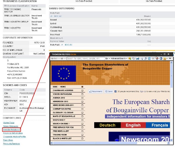 Today, the European Shareholder’s (ESBC) homepage www.bougainville-copper.eu had been recognized by international news service provider Reuters. As long as Bougainville Copper Limited (BCL) does not provide an own investor relations site the news network will refer to the ESBC’s site as research source for investors. Currently the official site of Bougainville Copper Limited www.bcl.com.pg is under construction due to major technical problems of its IT service provider. During this period of time the ESBC homepage provides the only information pool worldwide on BCL. The homepage contains 700 pages with comprehensive updates on news and documents.
