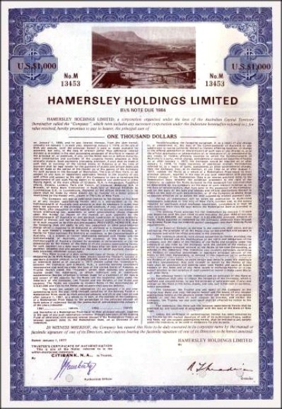 Beautifully engraved certificate from the Hamersley Holdings Limited issued in 1977. This historic document was printed by the American Banknote Company and has an ornate border around it with a vignette of a factory. This item has the printed signatures of the Company’s Director and is over 24 years old.